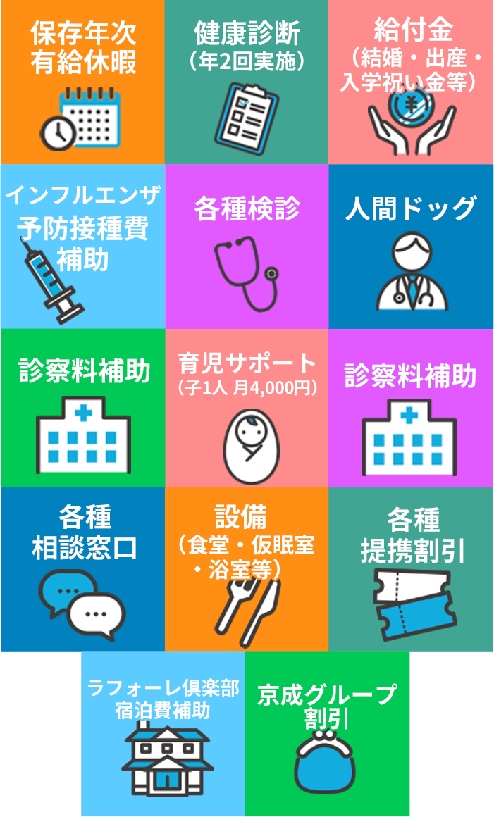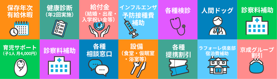 | 福利厚生 | 健康診断(年2回)、人間ドック、その他各種検診、インフルエンザ予防接種費補助、 診察料補助、各種相談窓口、ラフォーレ倶楽部一部施設の利用額補助、保養所(箱根) 各種給付金(結婚、出産、入学祝い金等)、各種設備(食堂、仮眠室、浴室等) 各種提携割引、京成グループ割引 |