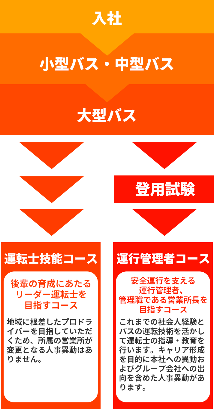 入社後「運転士技能コース」と「運行管理者コース」2つのコースをご用意しております。