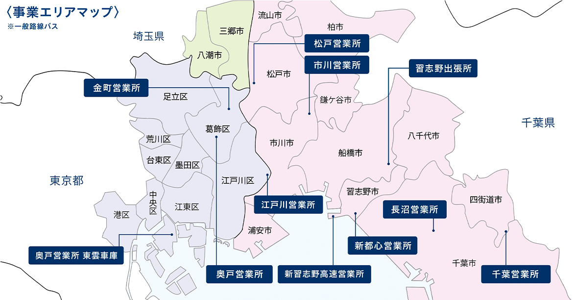 | 勤務地 | 江戸川営業所/東京都江戸川区東篠崎1-9-1 奥戸営業所/東京都葛飾区奥戸2-9-26 金町営業所/東京都葛飾区金町1-12-18 松戸営業所/千葉県松戸市古ケ崎101 市川営業所/千葉県市川市柏井町4-271-2 新都心営業所/千葉県習志野市芝園2-7-3 習志野出張所/千葉県船橋市習志野4-15-15 千葉営業所/千葉県四街道市吉岡1181-1 長沼営業所/千葉県千葉市稲毛区長沼町332-2 新習志野高速営業所/千葉県習志野市茜浜3-7-4 面接時に第3希望まで配属先をお伺いし、決定します。 ※ご希望に沿えない場合もありますが、最大限考慮します。 ※原則、転勤はありません。 ◆入社時転居支度金制度◆ 遠方からの転居はもちろん、近隣からの転居もサポートします。 正社員運転士の採用試験合格後、配属となる営業所から10km未満の場所に転居した場合、入社後の初回給与で20万円を支給します。※配属営業所の条件あり |