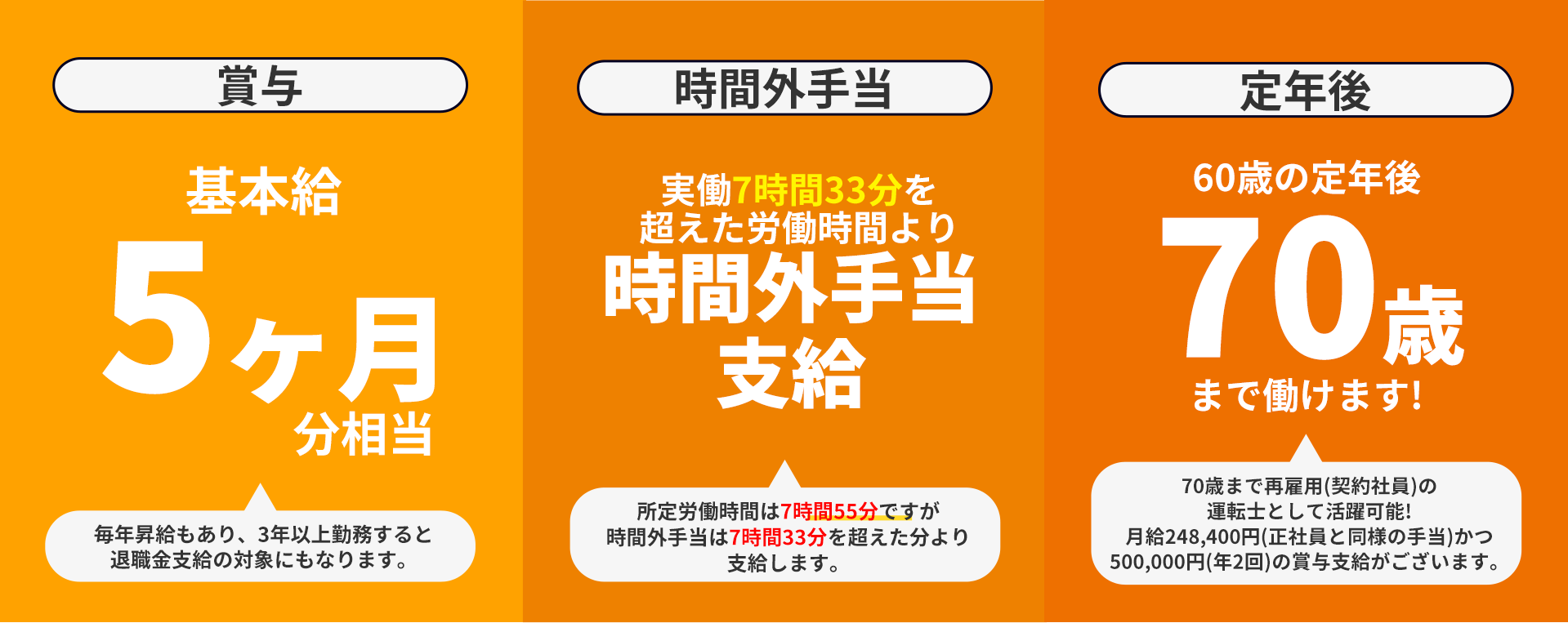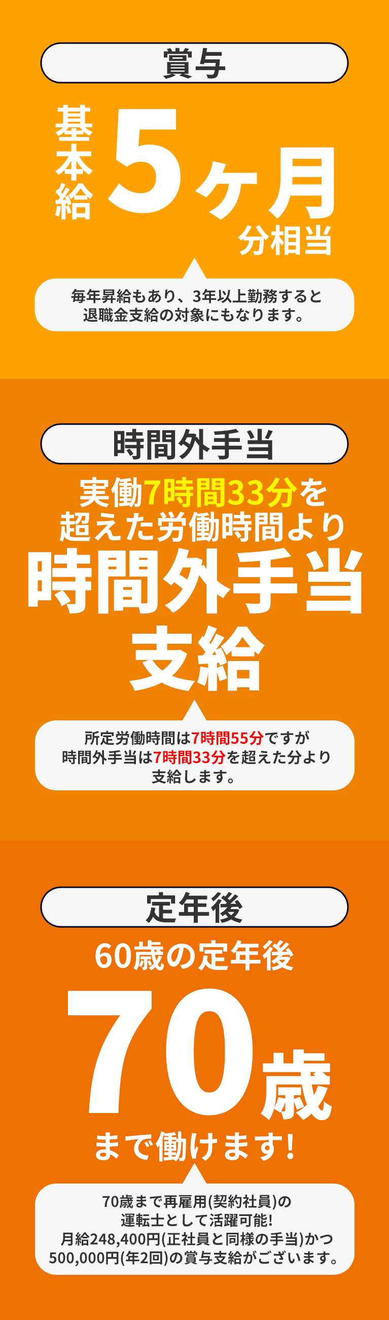 | 給与 | ◎ 月給231,000円+時間外等諸手当 ◎ 年収例 入社2年目:520万円程度(平均値) ※営業所・担当路線による ◎ 昇給:年1回 ◎ 賞与:年2回(基本給5ヶ月相当) |