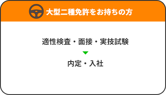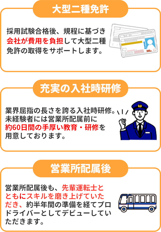 | 応募資格 | ◎ 過去5年間免許停止がなく、累積点数が2点以下の方 ◎ 大型二種免許所持者、または普通自動車運転免許取得後3年以上の方 ※ 免許取得費用を当社が全額負担する「運転士養成制度」の適用は応募時年齢が55才以下の方 |